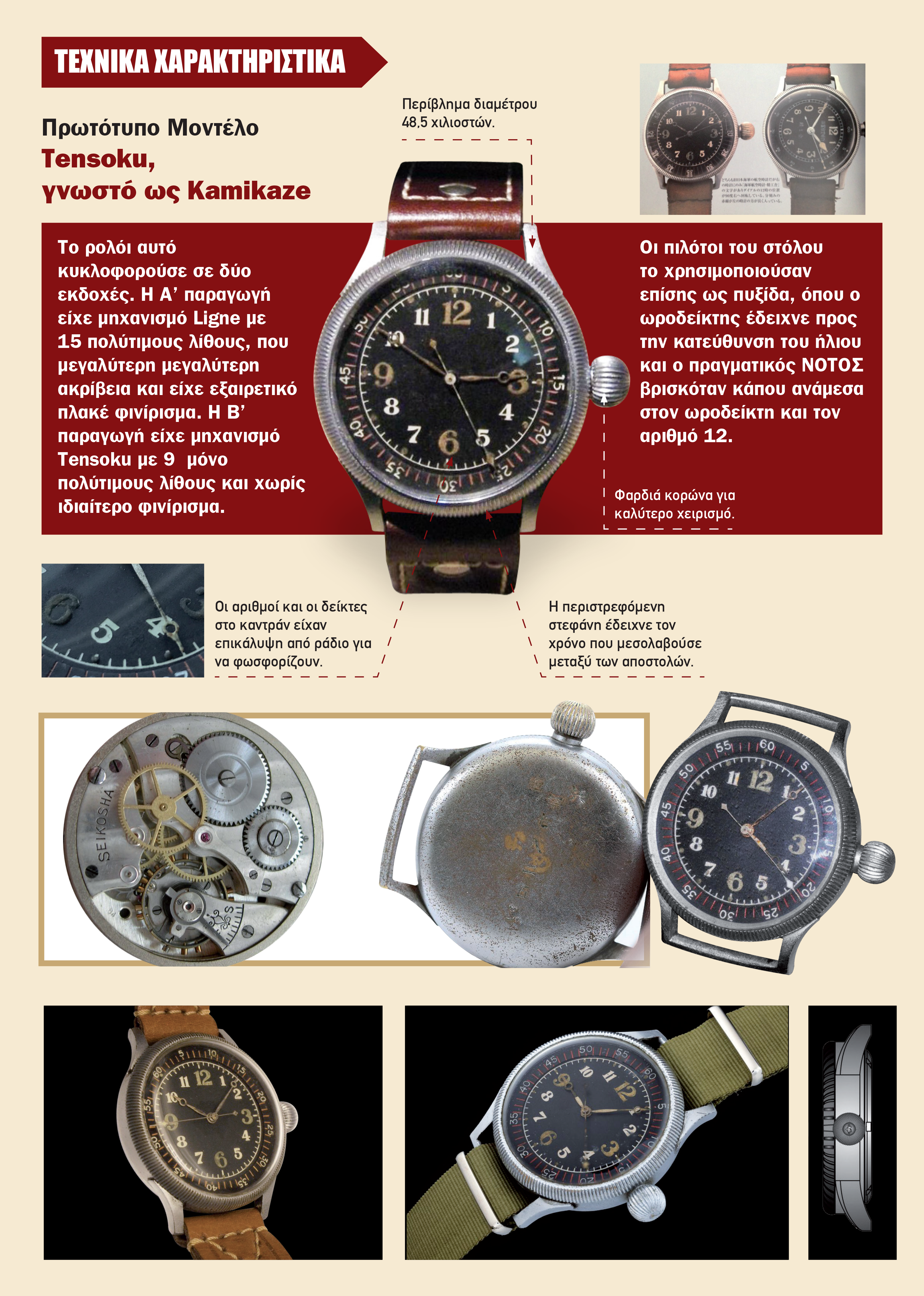 Το ρολόι αυτό, μοντέλο Seikosha Κamikaze, το φορούσαν στον καρπό τους οι Ιάπωνες πιλότοι αυτοκτονίας ενώ πραγματοποιούσαν την ύστατη αποστολή τους. H ονομασία του ακούγεται ίσως οικεία επειδή η Seikosha ανήκε στη δημοφιλή ωρολογοποιία Seiko, που κατασκεύαζε ρολόγια για στρατιωτικούς και πολίτες από τον 19ο αιώνα.